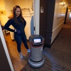 "Champ," a room service robot, leaves a room after a delivery to Jessica Martin, director of sports and events, at the Rising Star Sports Ranch in Mesquite, Nev. Tuesday, Nov. 28, 2017.  Food or delivery items are kept in a compartment at the top of the robot.