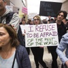Holly Smith, center, of Las Vegas holds a sign during a rally protesting President Trump's immigration order at McCarran International Airport in Las Vegas Sunday, Jan. 29, 2017.