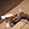 A pair of cowboy boots is shown in the street outside the concert venue after a mass shooting at a music festival on the Las Vegas Strip Sunday, Oct. 1, 2017.