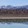 Mountains are reflected in an evaporation pond at the Silver Peak lithium mine near Tonopah, Nev. Monday, Jan. 30, 2017.