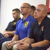 Angelo Aragon, right, president of the Professional Fire Fighters of Nevada, listens during a news conference at the International Association of Firefighters Union Hall, Local 1285, Tuesday, Oct. 3, 2017. Several firefighters who were off-duty and attending the Route 91 Harvest festival on Sunday shared their experiences.