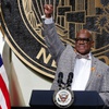 Pastor Michael Hatch gives a "Vegas Strong" salute in Las Vegas City Hall following a Unity Prayer Walk Saturday, Oct. 7, 2017.