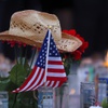 A hat rests on flowers in a makeshift memorial during a vigil, marking the one-week anniversary of the Oct. 1 mass shooting, at Sahara Avenue and The Strip Sunday, Oct. 8, 2017.