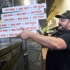 Owner Branden Powers lifts a stack of pizzas in the kitchen at Evel Pie, 508 E. Fremont St., in downtown Las Vegas Sunday, Oct. 8, 2017. The pizza shop, in collaboration with the Helpful Hoodlums charity group, is donating pizza and drinks to first responders in the wake of the Oct. 1 Route 91 Harvest festival mass shooting.