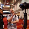 George Gallant, center, questions Azad Abbasi, founder and CEO of Genius Marketing, on the "Samsung Rover" during the National Association of Broadcasters (NAB) show at the Las Vegas Convention Center Tuesday, April 10, 2018. The rover is based on a Mantis platform with a 17-camera Samsung 360 Round on top. The remote-controlled rover can create and stream 360-degree video in 4K without getting the operator in the video.