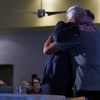 Jim Murren, chairman/CEO of MGM Resorts International, gives a hug to Andrew Hustak, a former Catholic Charities of Southern Nevada client, after Hustak shared his experiences during a news conference at the Three Square food bank Wednesday, Jan. 17, 2018. MGM Resorts International announced a surplus banquet food donation program they hope will provide 800,0000 meals by 2020.