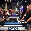 Canadians Jon McCartney, left, and Robert Ward play a mechanical Atari Pong Table game at the Unis Technology booth during the Nightclub & Bar Convention and Trade Show at the Las Vegas Convention Center Tuesday, March 26, 2019. The table uses magnetic technology to recreate the traditional video game.