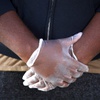 Nathaniel Manns, a bell captain at the Flamingo, is shown with protective gloves outside his apartment in Henderson Wednesday, April 8, 2020.