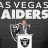 Las Vegas Raiders owner Mark Davis, center, speaks during a news conference, officially renaming the Oakland Raiders to the Las Vegas Raiders, in front of Allegiant Stadium Wednesday, Jan. 22, 2020. Raiders president Marc Badain listens at right.