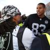 Tight end Darren Waller talks with a construction worker in Raiders garb during a news conference to officially rename the Oakland Raiders to the Las Vegas Raiders, in front of Allegiant Stadium, Wednesday, Jan. 22, 2020.