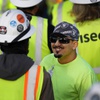 Construction workers wait for the start of a news conference, officially renaming the Oakland Raiders to the Las Vegas Raiders, in front of Allegiant Stadium in Las Vegas Wednesday, Jan. 22, 2020.