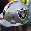 A man collects Raiders autographs on a helmet during a news conference, officially renaming the Oakland Raiders to the Las Vegas Raiders, in front of Allegiant Stadium in Las Vegas Wednesday, Jan. 22, 2020.
