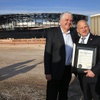Nevada Governor Steve Sisolak, left, and Las Vegas Raider president Marc Badain pose for a photo during a news conference, officially renaming the Oakland Raiders to the Las Vegas Raiders, in front of Allegiant Stadium in Las Vegas Wednesday, Jan. 22, 2020.