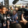 Las Vegas Raider tight end Darren Waller talks reporters during a news conference, officially renaming the Oakland Raiders to the Las Vegas Raiders, in front of Allegiant Stadium in Las Vegas Wednesday, Jan. 22, 2020.