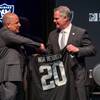 Jim Murren, right, chairman and CEO of MGM Resorts International, poses with Marc Badain, president of the Las Vegas Raiders, during a news conference at Mandalay Bay Thursday, Jan. 23, 2020. MGM Resorts International announced a founding partnership with the Las Vegas Raiders.