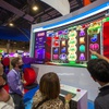 Attendees line up to play in a video slot tournament during the Global Gaming Expo (G2E) at the Sands Expo Center Tuesday, Oct. 5, 2021.